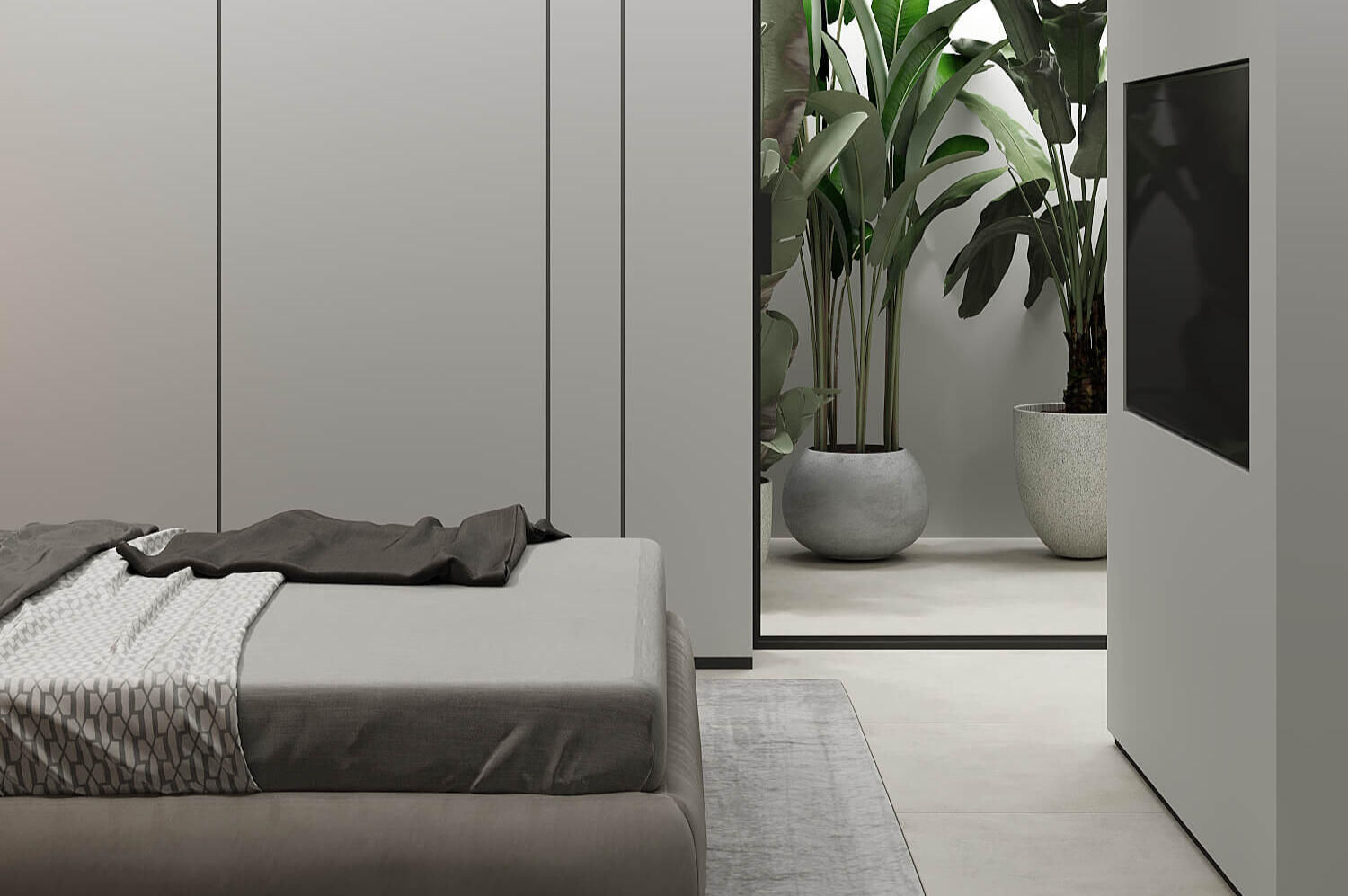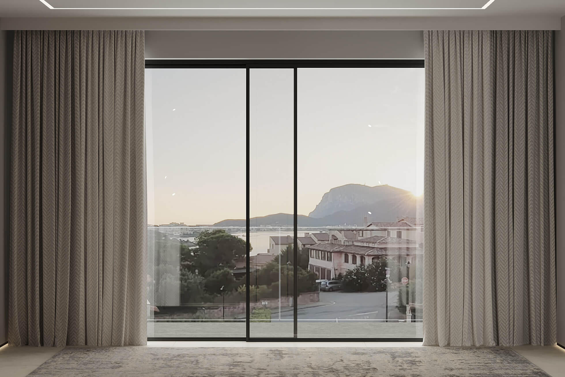Large windows fill the space with Sardinian light, while natural materials and soft tones create an elegant, relaxing atmosphere.